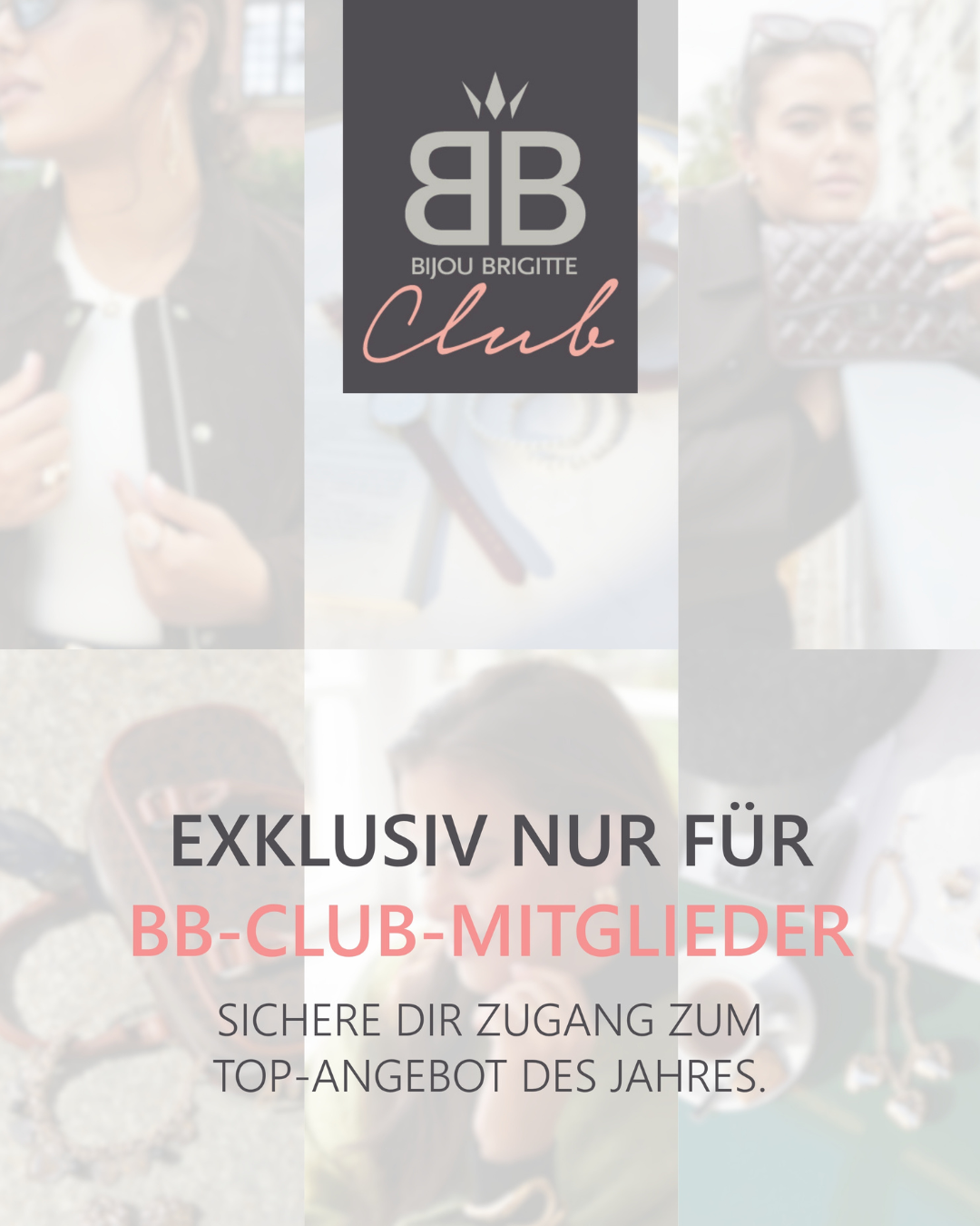 *Die Aktion gilt exklusiv für BB-Club-Mitglieder vom 07. bis 09. November 2025 in allen Bijou Brigitte-Filialen in Deutschland und im deutschen Online-Shop mit dem Code „member25“. Nicht mit anderen Aktionen kombinierbar. Der Rabatt gilt für das gesamte Sortiment, ausgenommen Echtschmuck, Taschen und Gutscheinkarten/Gutscheincodes. Eine Barauszahlung oder nachträgliche Gewährung sind nicht möglich.